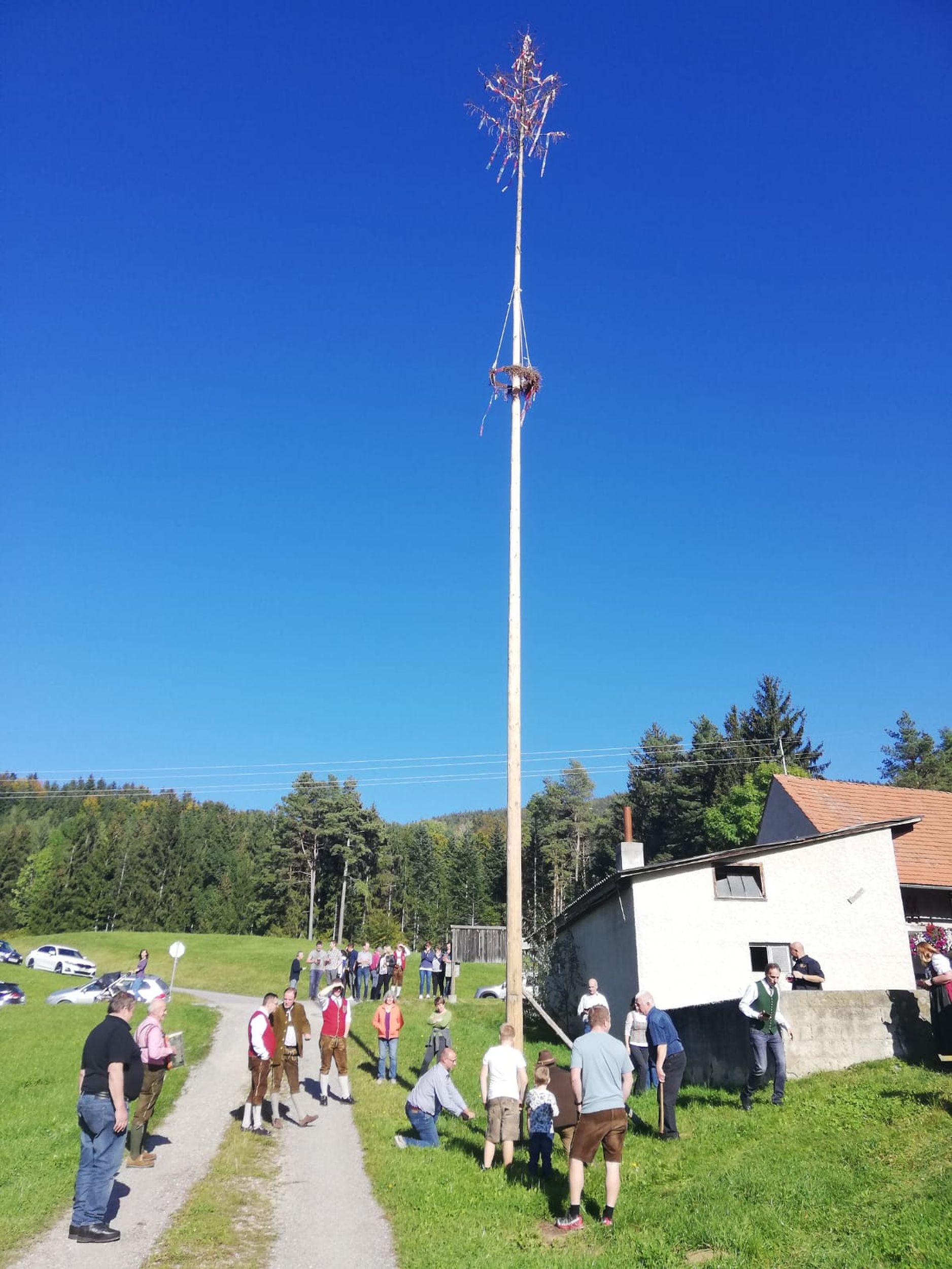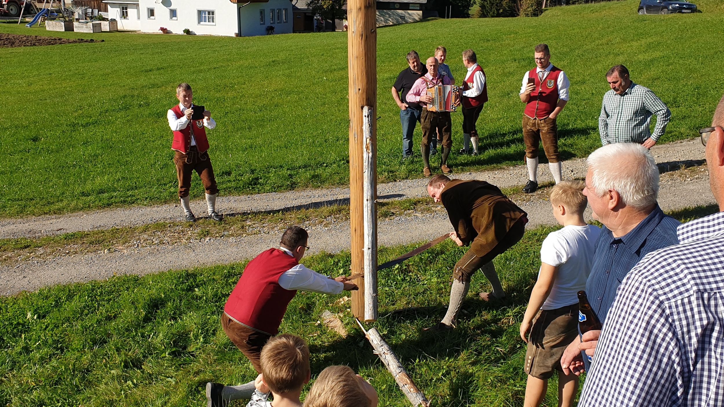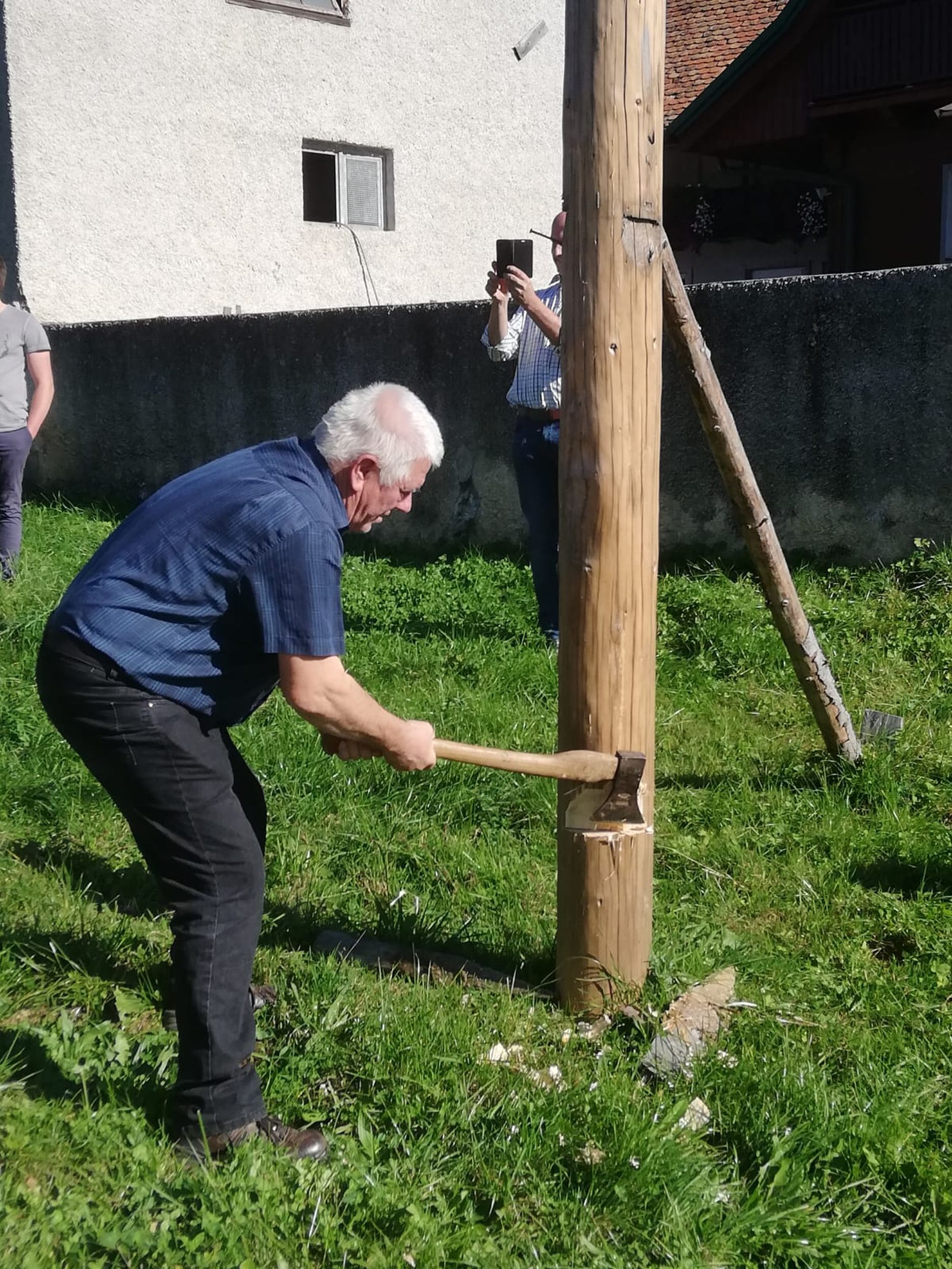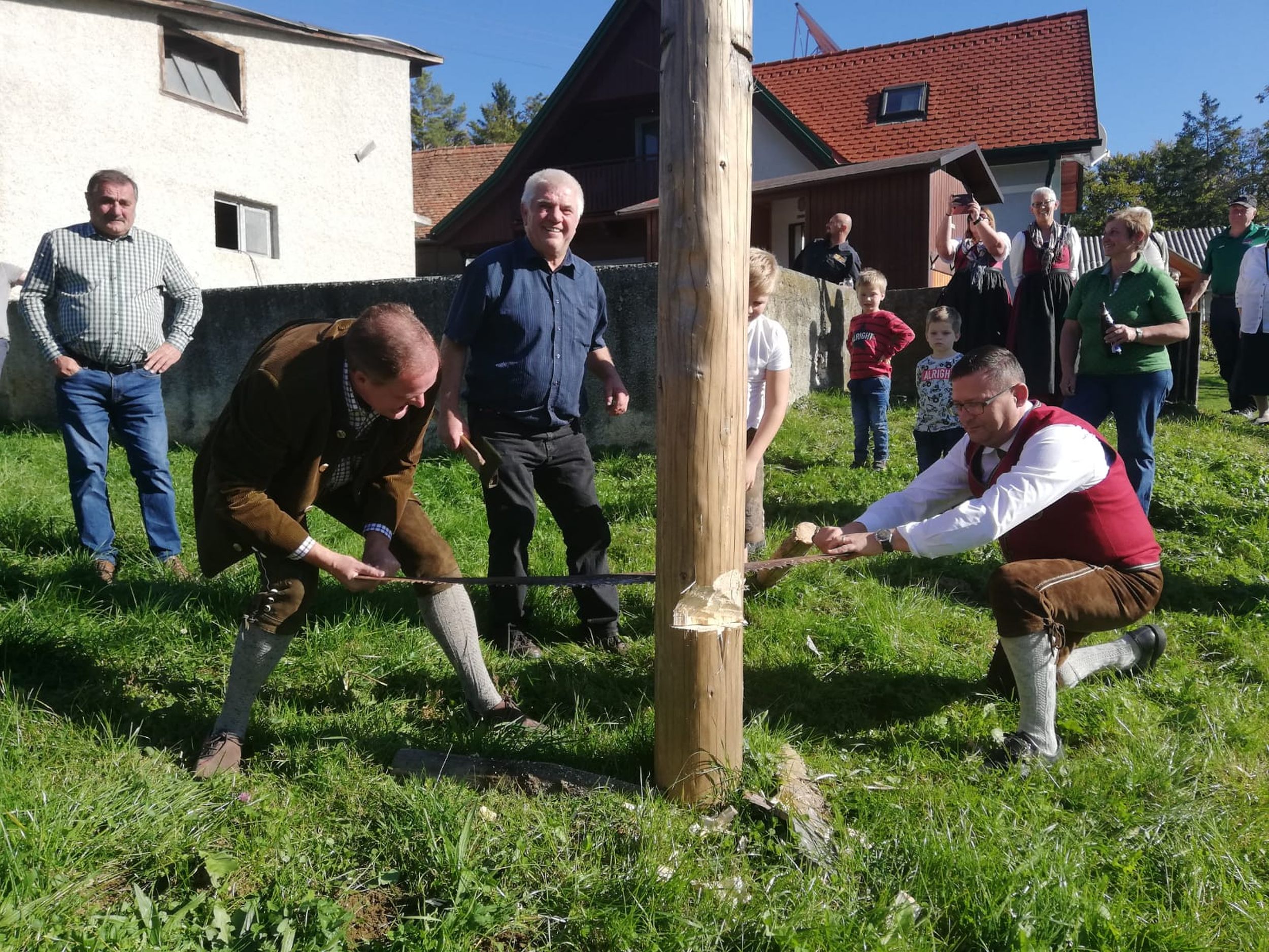 Nach Stärkung bei einem gemeinsamen Mittagessen mussten unser Kapellmeister Klaus Maurer und der Bürgermeister der Gemeinde Naas Bernhard Ederer noch Hand anlegen, und beim Umschneiden des Maibaums helfen.