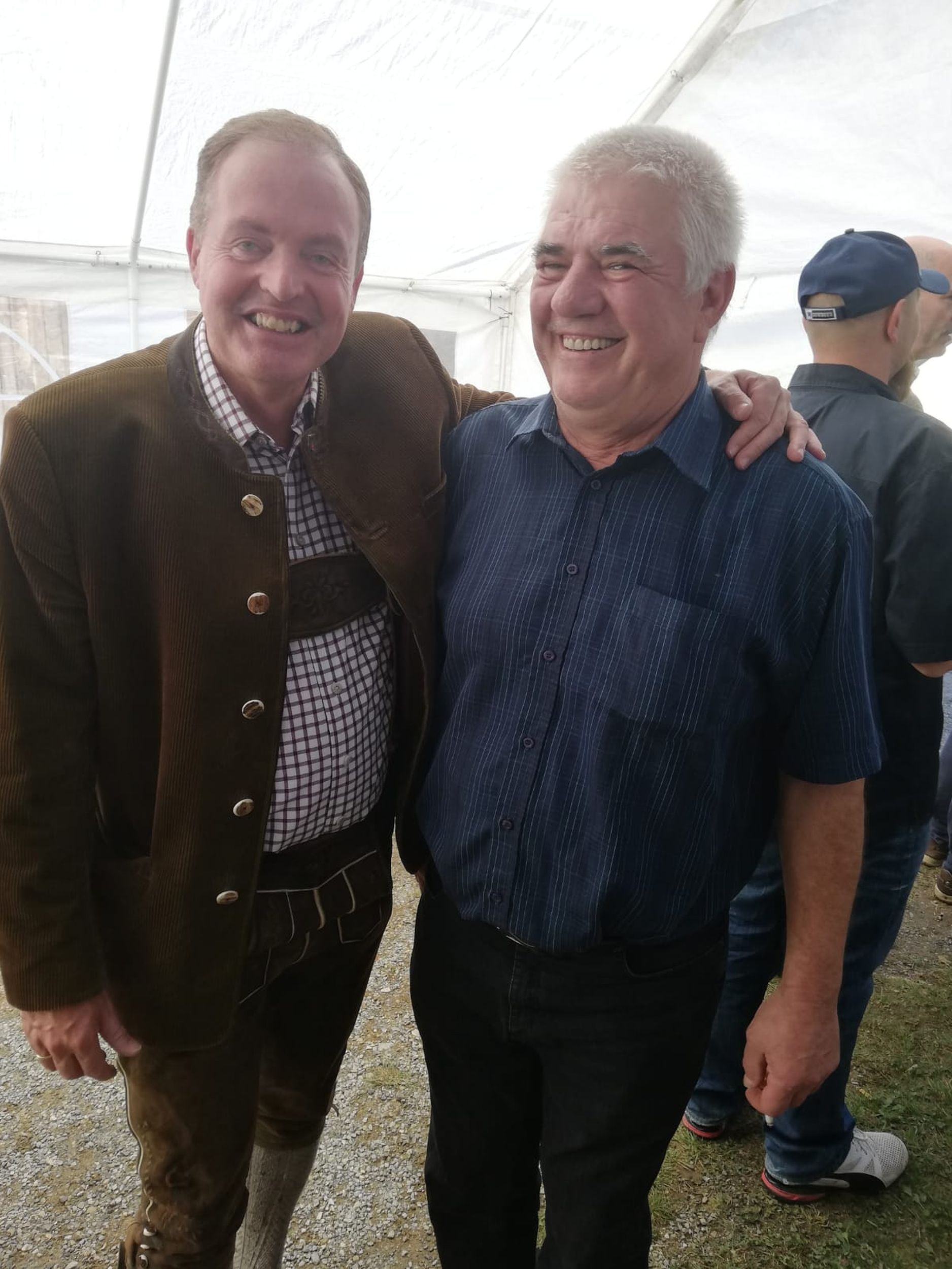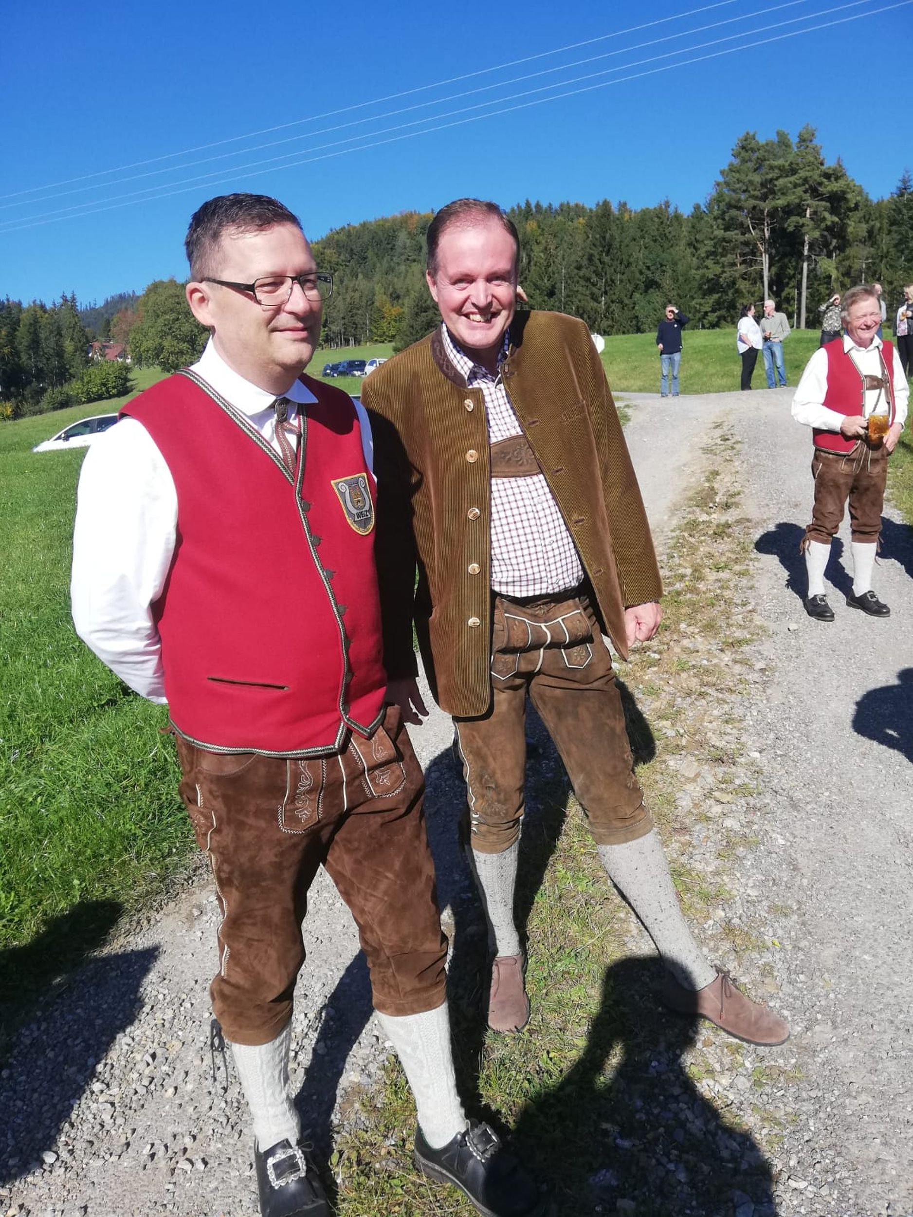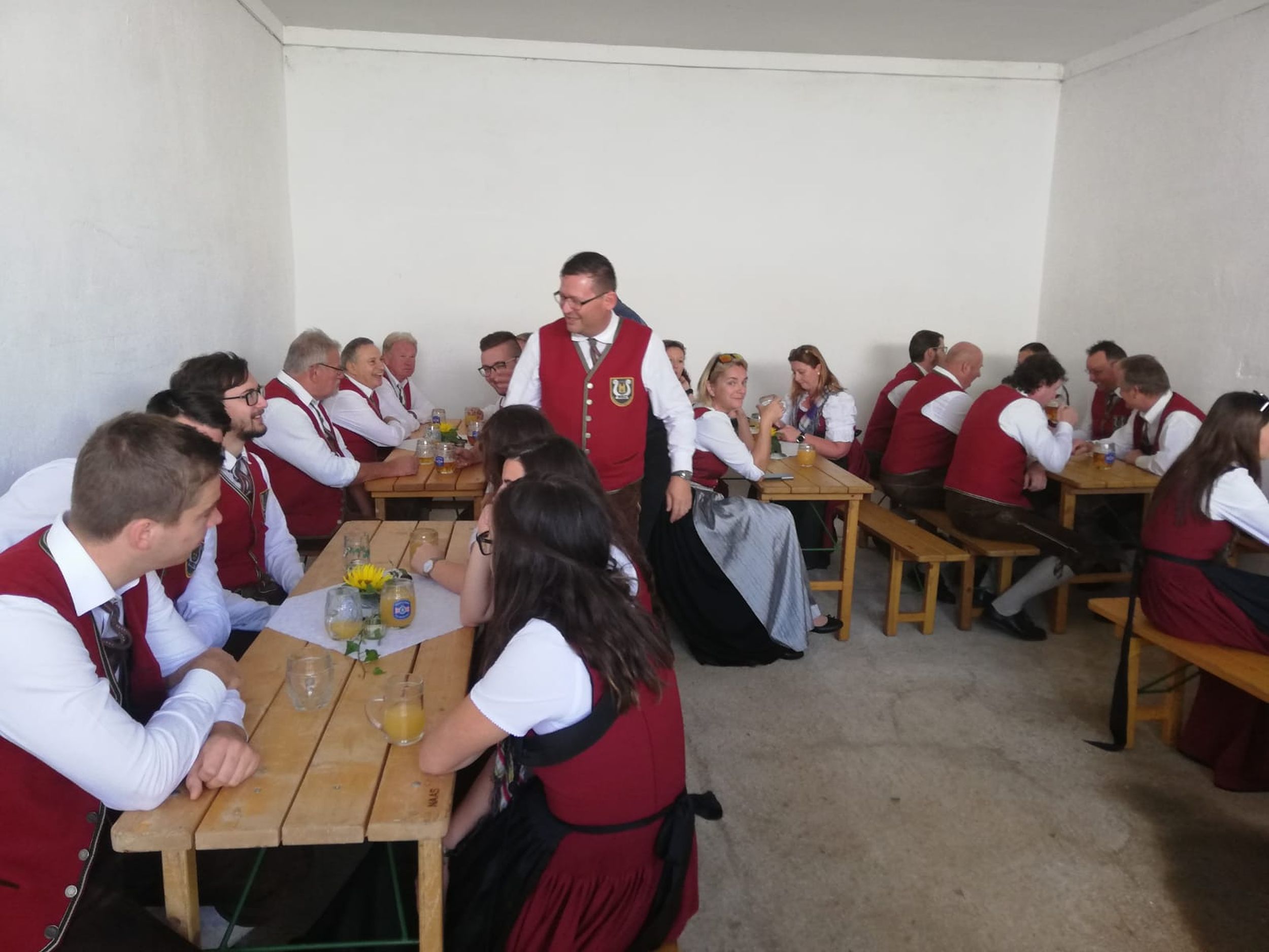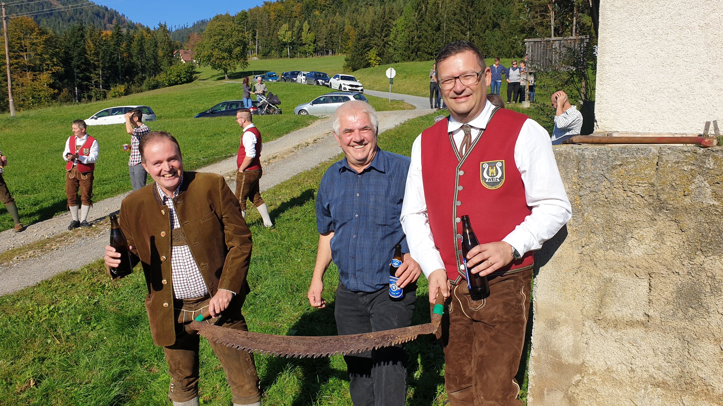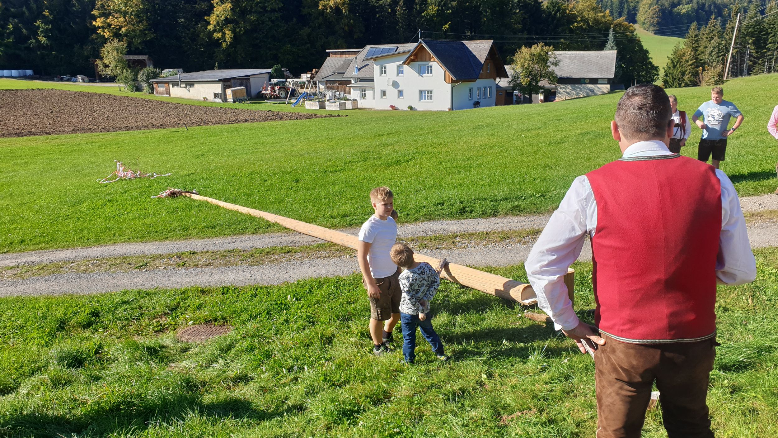 Nach Stärkung bei einem gemeinsamen Mittagessen mussten unser Kapellmeister Klaus Maurer und der Bürgermeister der Gemeinde Naas Bernhard Ederer noch Hand anlegen, und beim Umschneiden des Maibaums helfen.