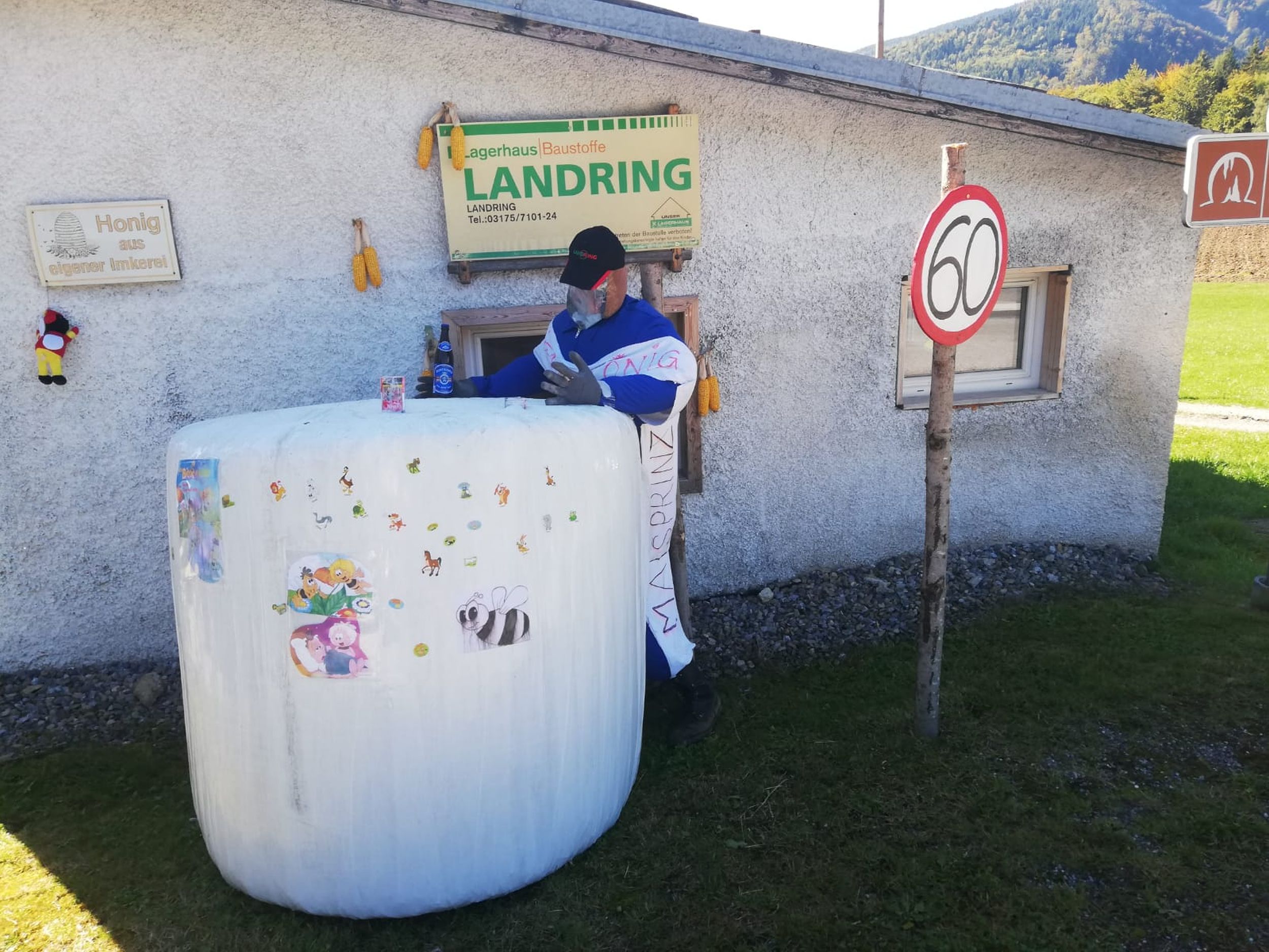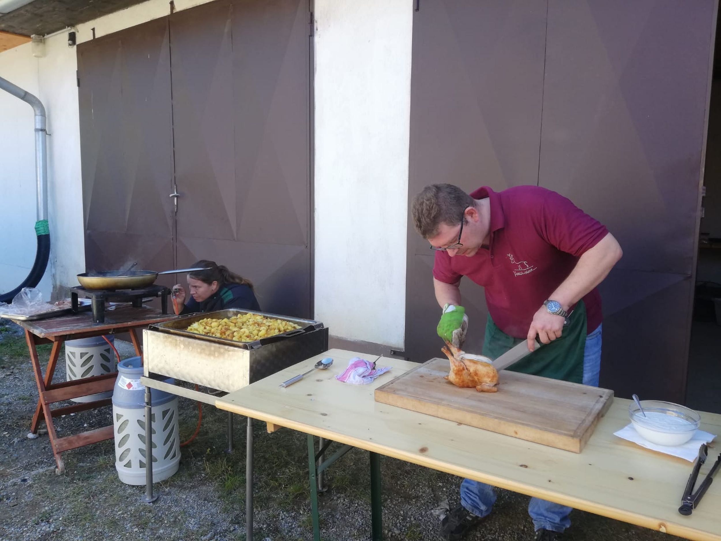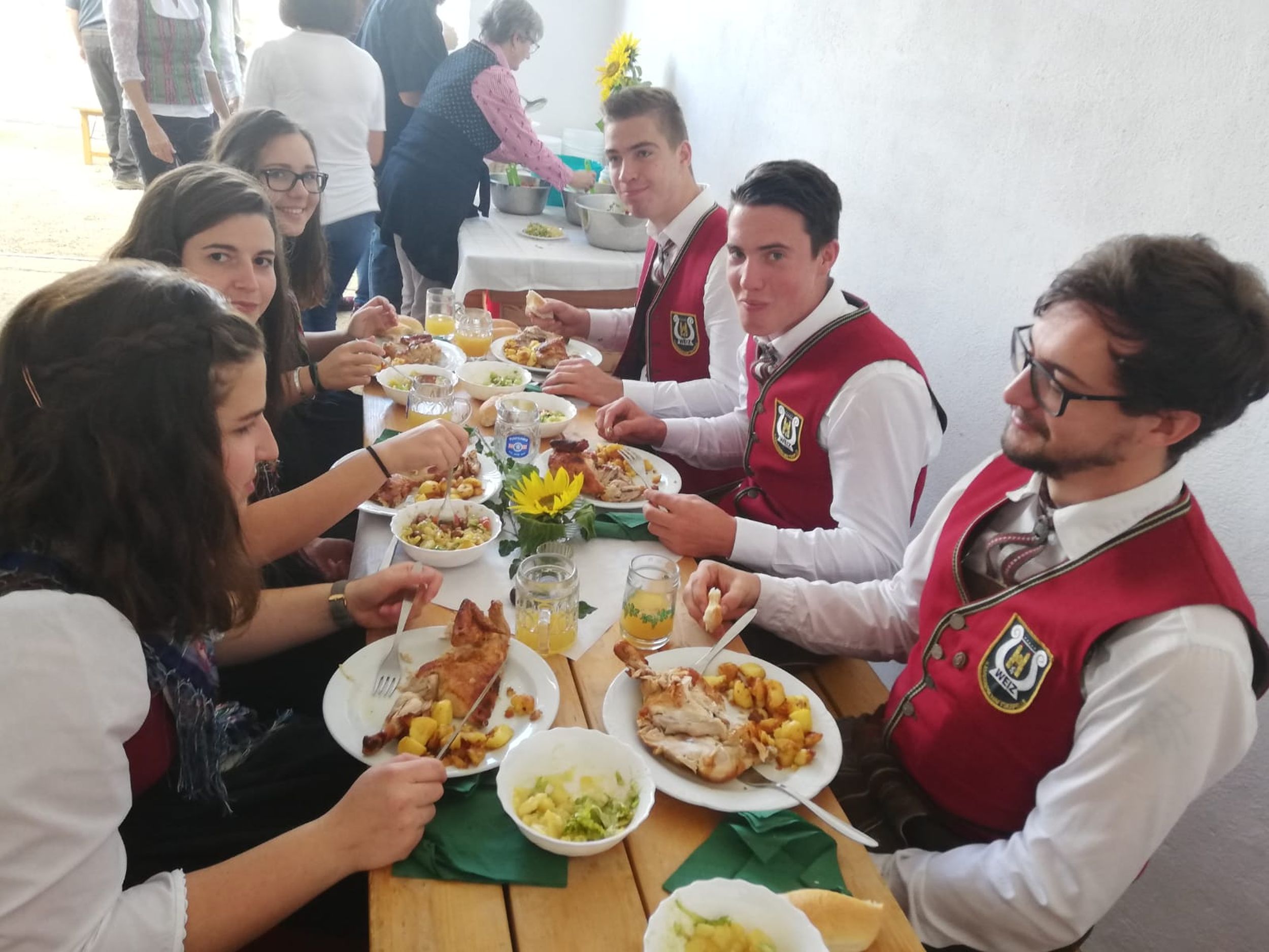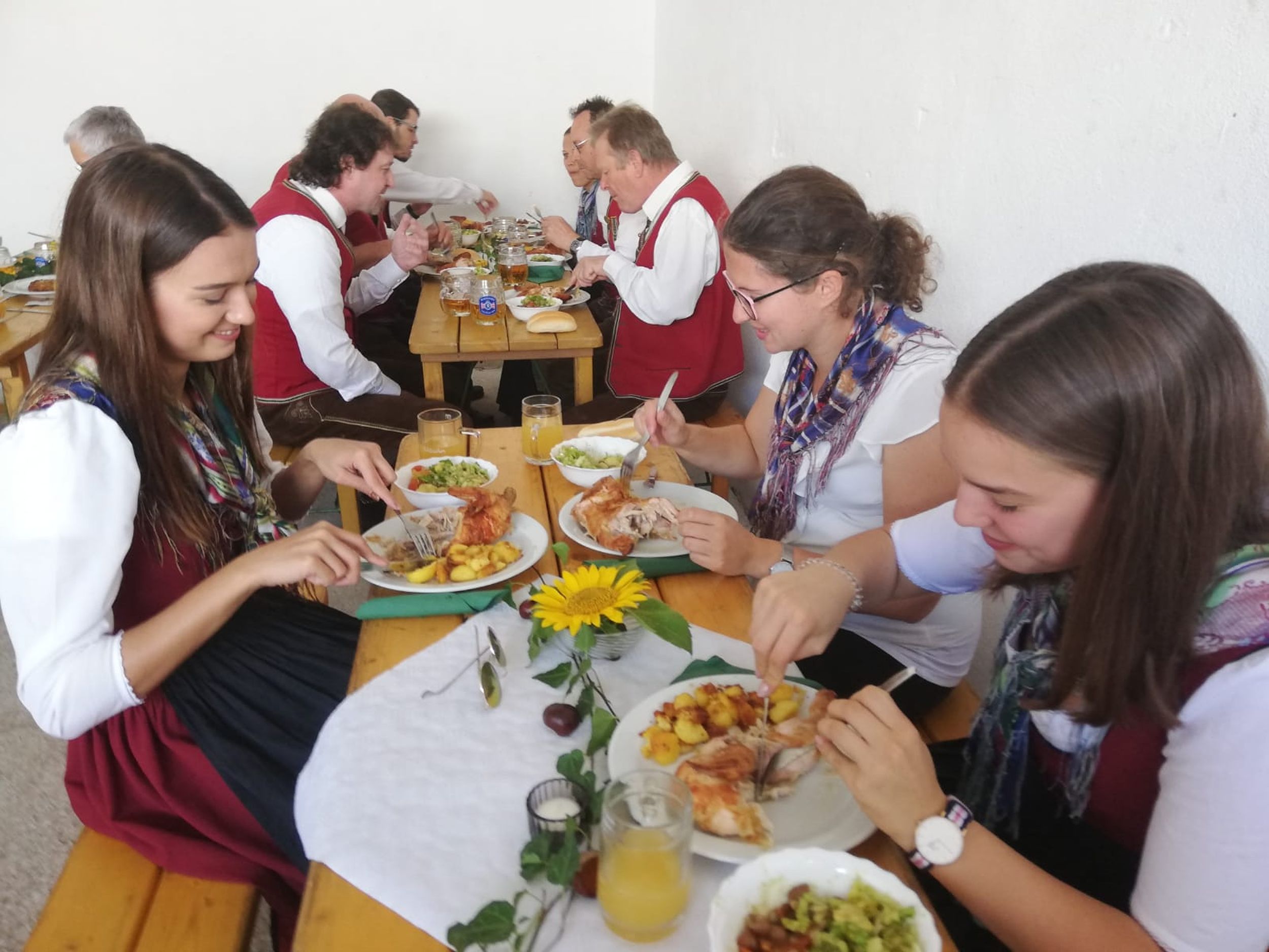 Nach Stärkung bei einem gemeinsamen Mittagessen mussten unser Kapellmeister Klaus Maurer und der Bürgermeister der Gemeinde Naas Bernhard Ederer noch Hand anlegen, und beim Umschneiden des Maibaums helfen.
