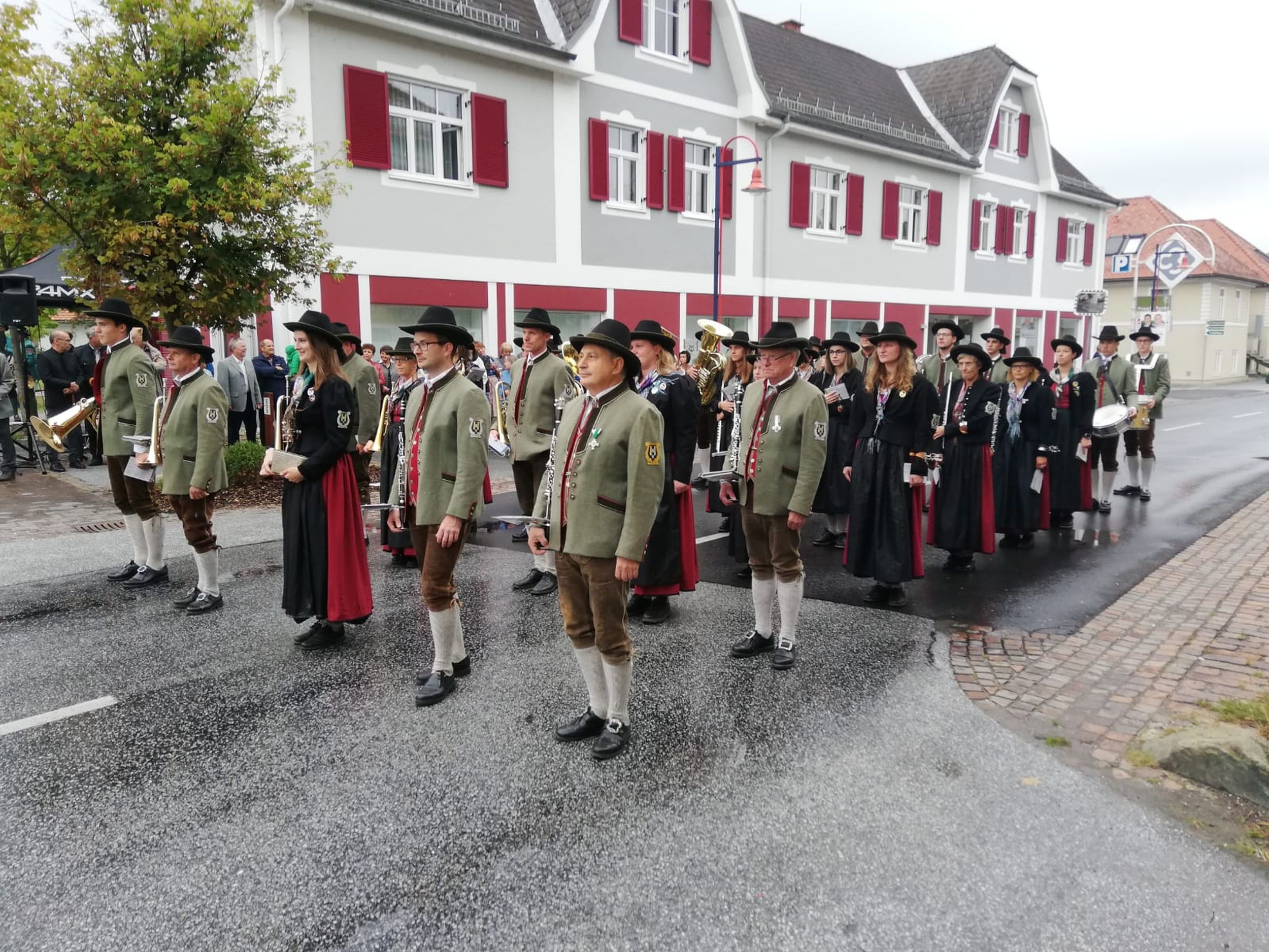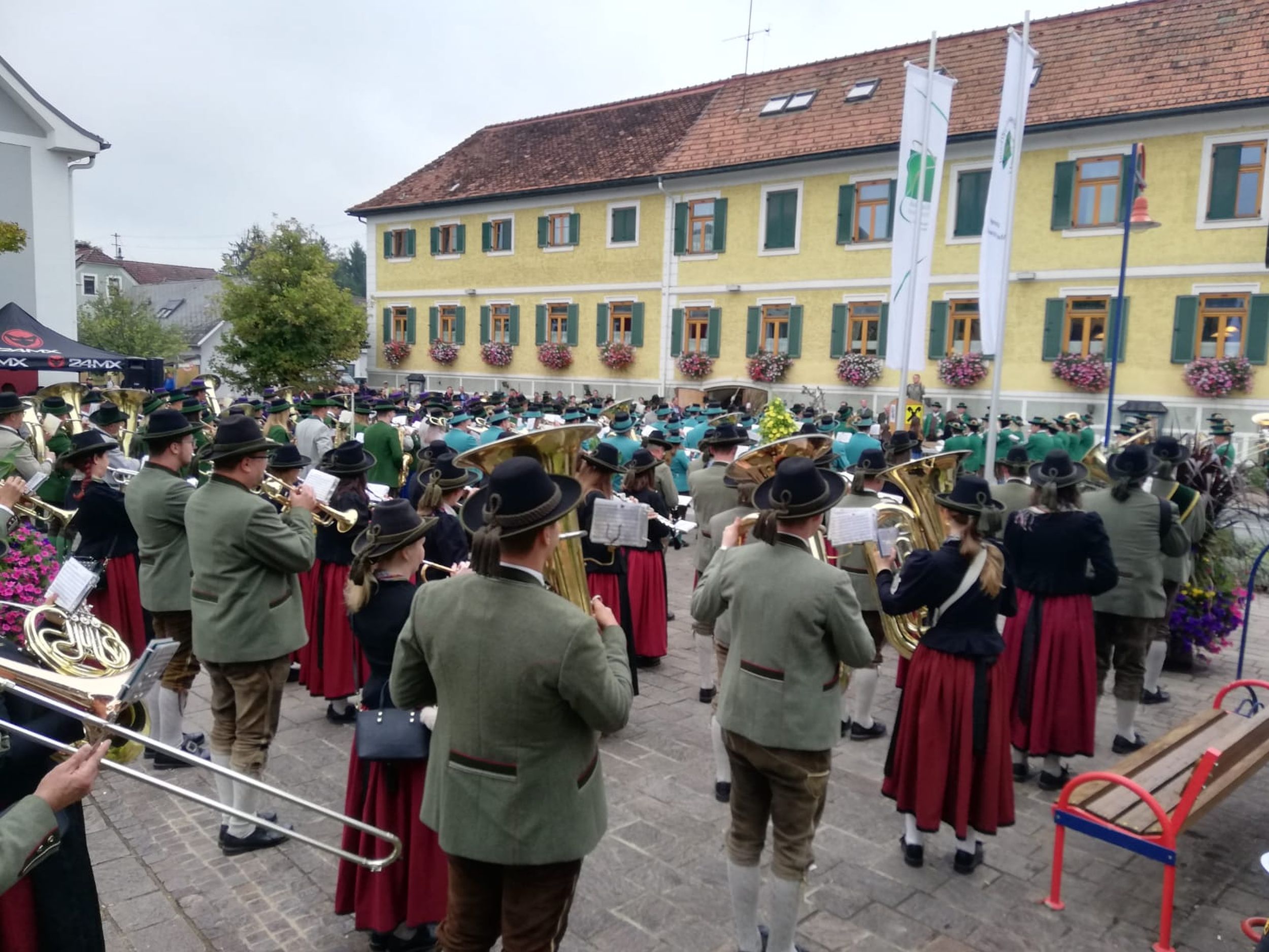 Auch wir waren beim Bezirksmusikertreffen mit dabei. Nach dem Marsch auf den Dorfplatz fand der Festakt mit einem gemeinsamen Monsterkonzert statt. Anschließend marschierten wir in die Festhalle zum gemütlichen Beisammensein.