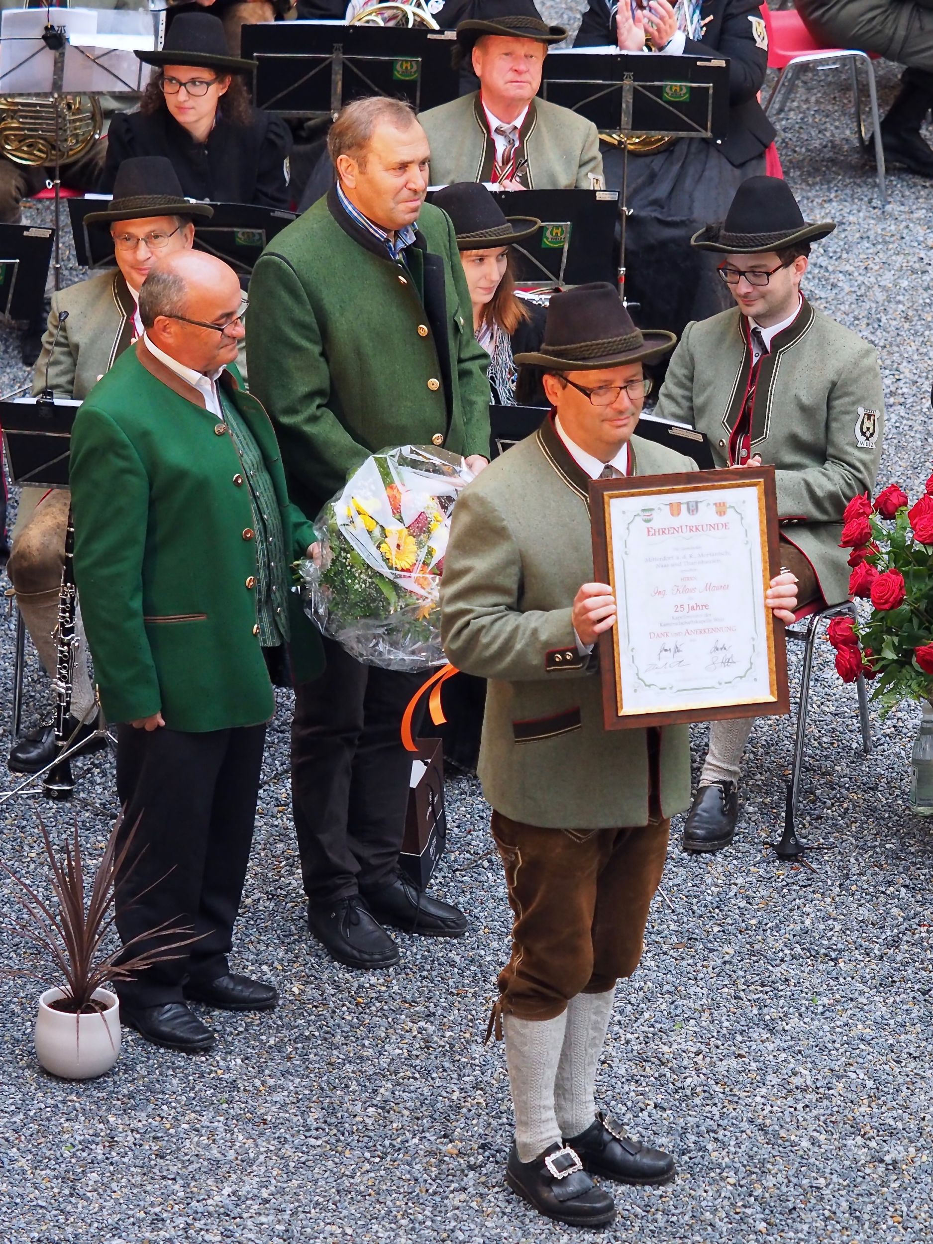 Unser Kapellmeister wurde von den Gemeinden aufgrund seiner 25-jährigen Tätigkeit als Kapellmeister mit einer Ehrenurkunde ausgezeichnet und unser Musiker Josef Ponsold wurde für seine 65-jährige Mitgliedschaft von unserem Obmann geehrt.